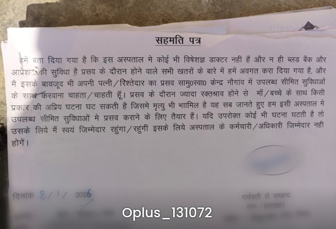 ​नौगांव CHC पहुंचे एक व्यक्ति को अपनी गर्भवती पत्नी का प्रसव कराने के लिए अस्पताल प्रबंधन के सामने घुटने टेकने पड़े। अस्पताल ने लिखित में यह स्वीकारोक्ति ली कि यहाँ न तो कोई विशेषज्ञ डॉक्टर है, न ब्लड बैंक और न ही ऑपरेशन (सिजेरियन) की कोई सुविधा। पत्र में स्पष्ट रूप से दर्ज किया गया कि प्रसव के दौरान यदि माँ या बच्चे की मृत्यु होती है, तो इसकी पूरी जिम्मेदारी परिजनों की होगी और अस्पताल प्रशासन का इसमें कोई दोष नहीं होगा।
